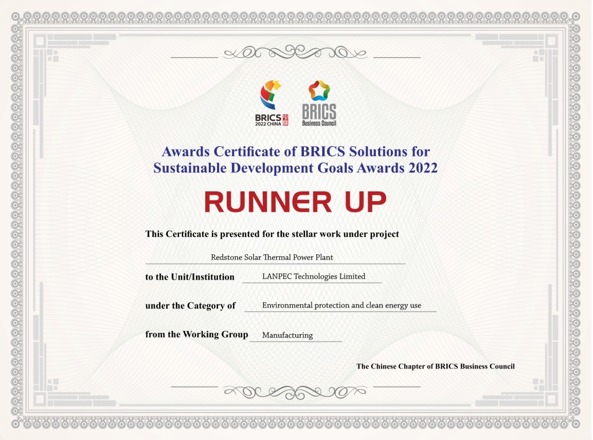 ????????南非紅石光熱電站項目獲得金磚國家可持續發展解決方案二等獎