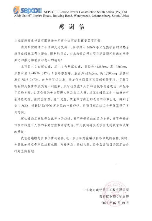 ????????????????????總包方頒發的南非紅石光熱項目感謝信