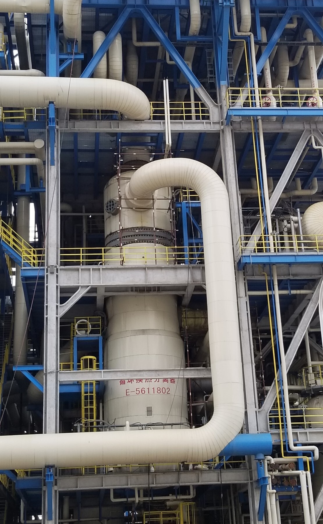 循環換熱分離器應用于煤制油裝置費托合成單元,將來自反應器的高溫油氣經與循環氣換熱冷卻并分離,分離后的液相重質油經加熱后送至汽提塔,分離后的氣相高溫油氣進入油氣空冷器冷卻。循環換熱分離器整合了板殼式換熱器高效傳熱與高效分離器高精度分離技術,采用防堵塞專用板型,傳熱效率高、分離精度高、傳熱與分離功能二合一,節省占地與配管空間。循環換熱分離器為首創產品,依托400萬噸/年煤間接液化成套技術創新開發及產業化項目榮獲2020年度國家科學技術進步一等獎。
