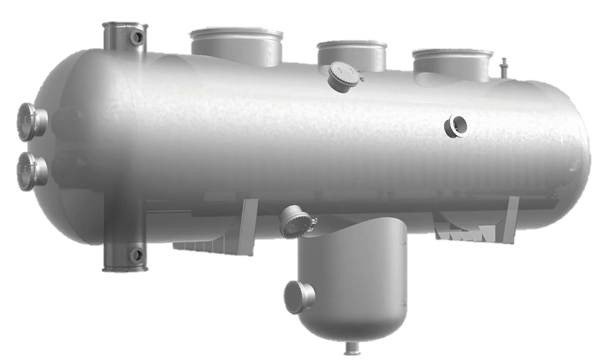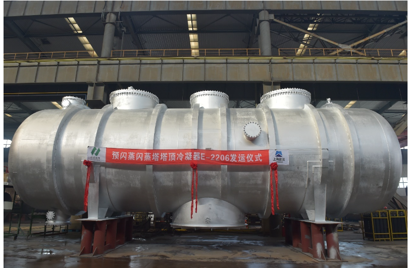 大型板殼式塔頂冷凝器采用安全回轉殼內裝傳熱板束,選用高效不等間距板式傳熱元件;熱側氣相采用短流程寬通道,壓降??;冷源側采用窄通道長流程通道,強化傳熱;殼內設置分離腔實現氣液相分離。大型板殼式塔頂冷凝器可集成預閃蒸塔與閃蒸塔所需冷凝器于一體,實現真空工況塔頂氣相大流量介質的冷凝、冷卻。